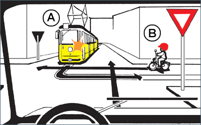 Ön a kormánykerékkel ábrázolt gépkocsit vezeti. Elsőbbséget kell-e adnia a szemből érkező gépkocsinak, ha balra kíván bekanyarodni?