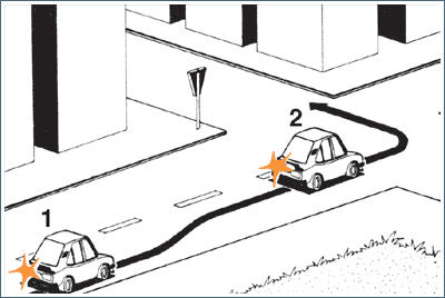Az ábrázolt párhuzamos közlekedésre nem alkalmas útról balra kíván bekanyarodni. Hol kell meggyőződnie arról, hogy balról más jármű nem kezdte-e előzni?