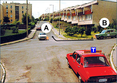 Az A jelű személygépkocsi az útkereszteződéstől 6 m-re várakozik. Szabályos-e?