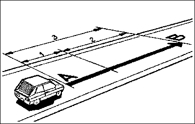 Az ábrán látható személygépkocsi vezetője az A pontban észleli az akadályt és a B pontban áll meg a járművel. Melyik távolság a reakcióidő alatt megtett út, a fékút és a féktávolság?