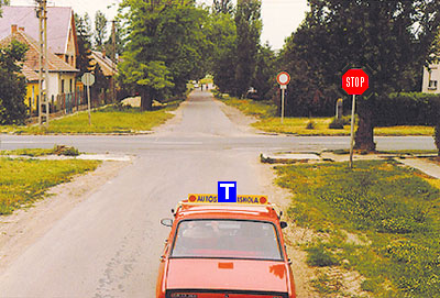 Ön a T jelzésű tanulókocsit vezeti. Ha nincs keresztező forgalom, akkor továbbhaladhat megállás nélkül?