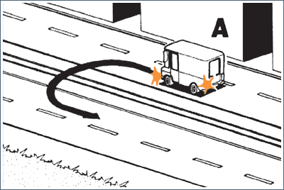 Szabályosan közlekedik-e az A jelű gépkocsi, ha a villamos-pályával ellátott úttesten megfordul?