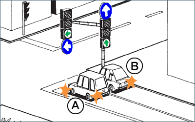 Bekanyarodhat-e az ábrázolt útkereszteződésben a B jelű gépkocsi jobbra?