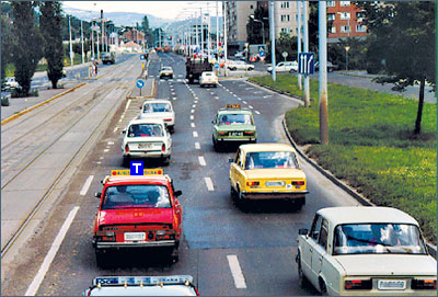 Ön a piros színű, T jelzésű gépkocsit vezeti. A gyorsabb előrehaladás érdekében változtathat-e forgalmi sávot?