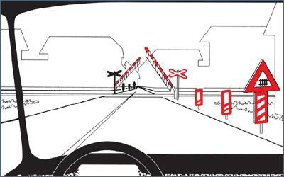 Megközelítheti-e a vasúti átjárót a kormánykerékkel ábrázolt gépkocsival az útra engedélyezett sebesség felső határát megközelítő tempóban?